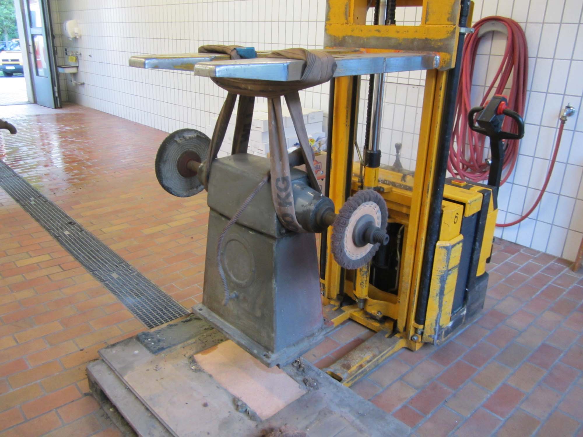 Hierfür haben wir die alte Poliermaschine wieder gereinigt und auf ein fahrbares Gestell montiert. Die Schmiernippel des Fahrgestells wurden poliert und wieder angebracht. Zuvor entfernten wir das alte Fett an den Schmierstellen und haben es durch neues Fett ersetzt. Auch die Bremse ist wieder montiert und eingestellt worden. Hier muss lediglich noch eine Rückholfeder erneuert werden.
