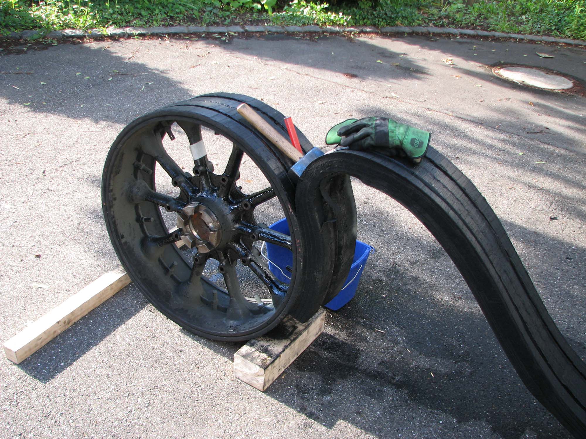 Die stark beschädigten Vollgummibeläge der Räder wurden mittlerweile entfernt und in nächster Zeit wird eine Schweizer Firma die Räder mit neuen Vollgummibelägen versehen.