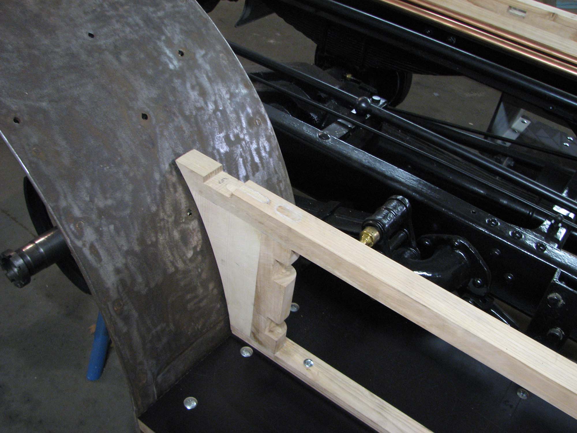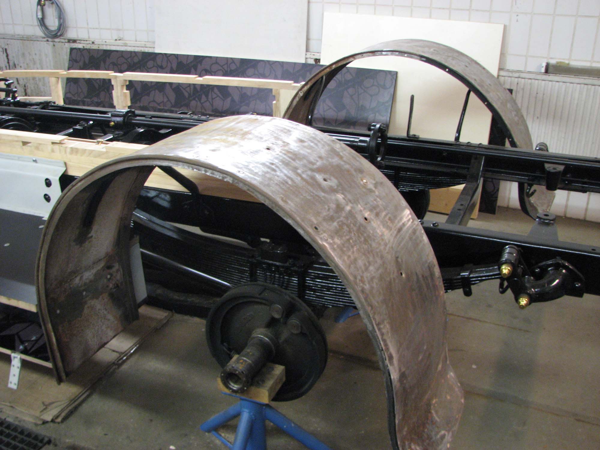 Dies ist Wichtig um letzte Korrekturen an den Seitenkästen durchzuführen und alle Teile gegenseitig anzupassen. Die hinteren Kotflügel sind hierfür vom gröbsten Schmutz und Rost befreit worden. Sie sind am unteren Ende mit den Kästen verschraubt. Das gleiche gilt für die vorderen Kotflügel, die im nächsten Schritt angepasst werden. Der gebogene obere Teil der Kästen passt sich hinten an die Rundung der Kotflügel an und Endet vorne am Armaturenbrett. Dieses wurde für diese Arbeiten schon einmal an die Halterungen geschraubt. Allerdings fehlen hier noch die endgültigen Konturen, die wir nach und nach wieder exakt rekonstruieren müssen. Da leider vom alten Brett nichts übrig geblieben ist, wird dies allerdings nicht ganz einfach werden. Parallel dazu werden gerade die Rückwand und die Klappen der Saugschlauchkästen hergestellt. Die Klappen sind dabei in aufwendiger Rahmenbauweise wieder so hergestellt worden wie dies schon früher der Fall war.