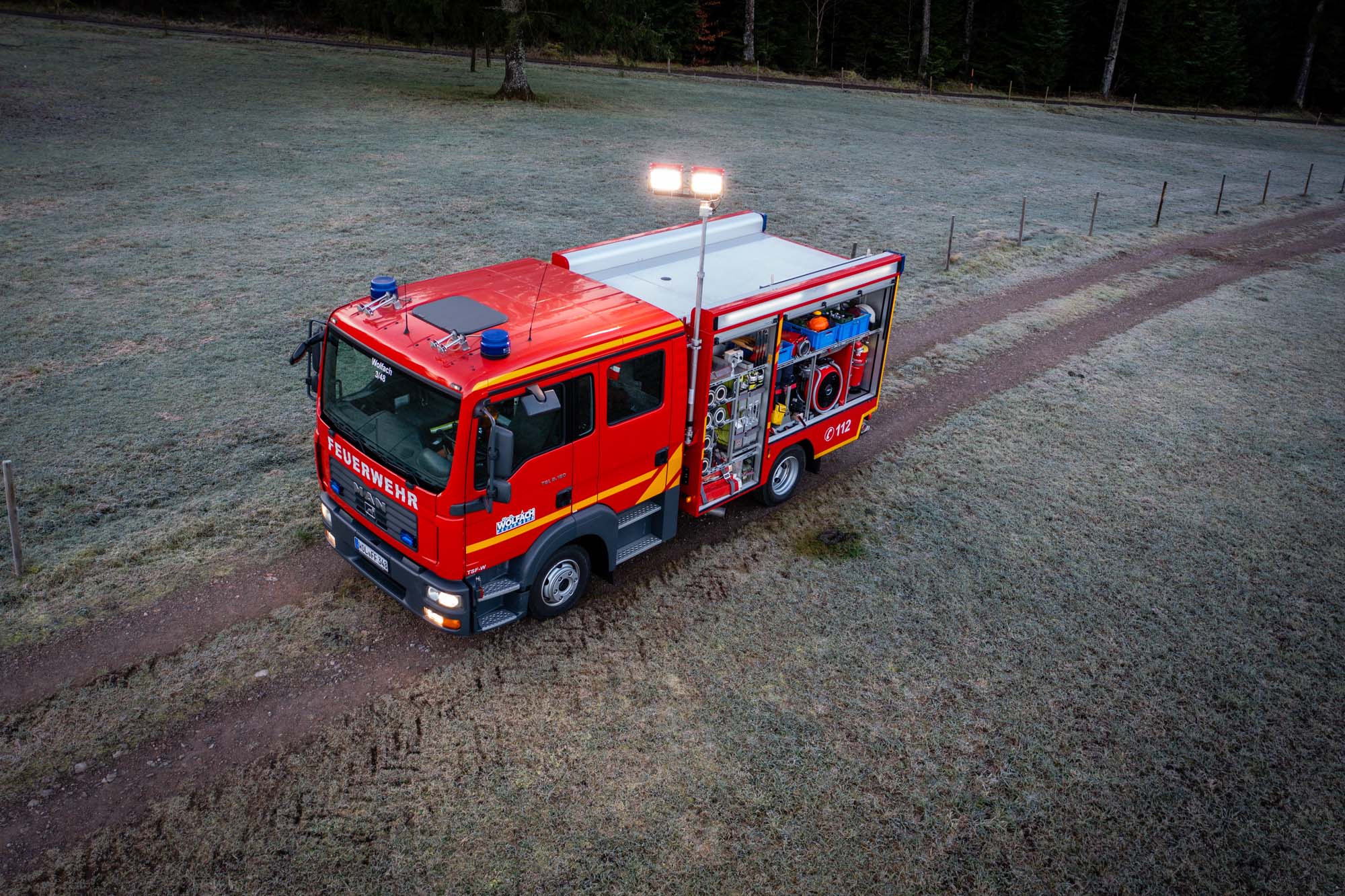 Im Mannschaftsraum sind 2 Atemschutzgeräte, die in den Rückenlehnen der Sitze eingebaut sind, vorhanden. So kann sich der erste Angriffstrupp bereits während der Anfahrt entsprechend ausrüsten. 2 weitere Atemschutzgeräte befinden sich im Aufbau. Um die Einsatzstelle auszuleuchten verfügt das Fahrzeug über einen fest angebauten Lichtmast.