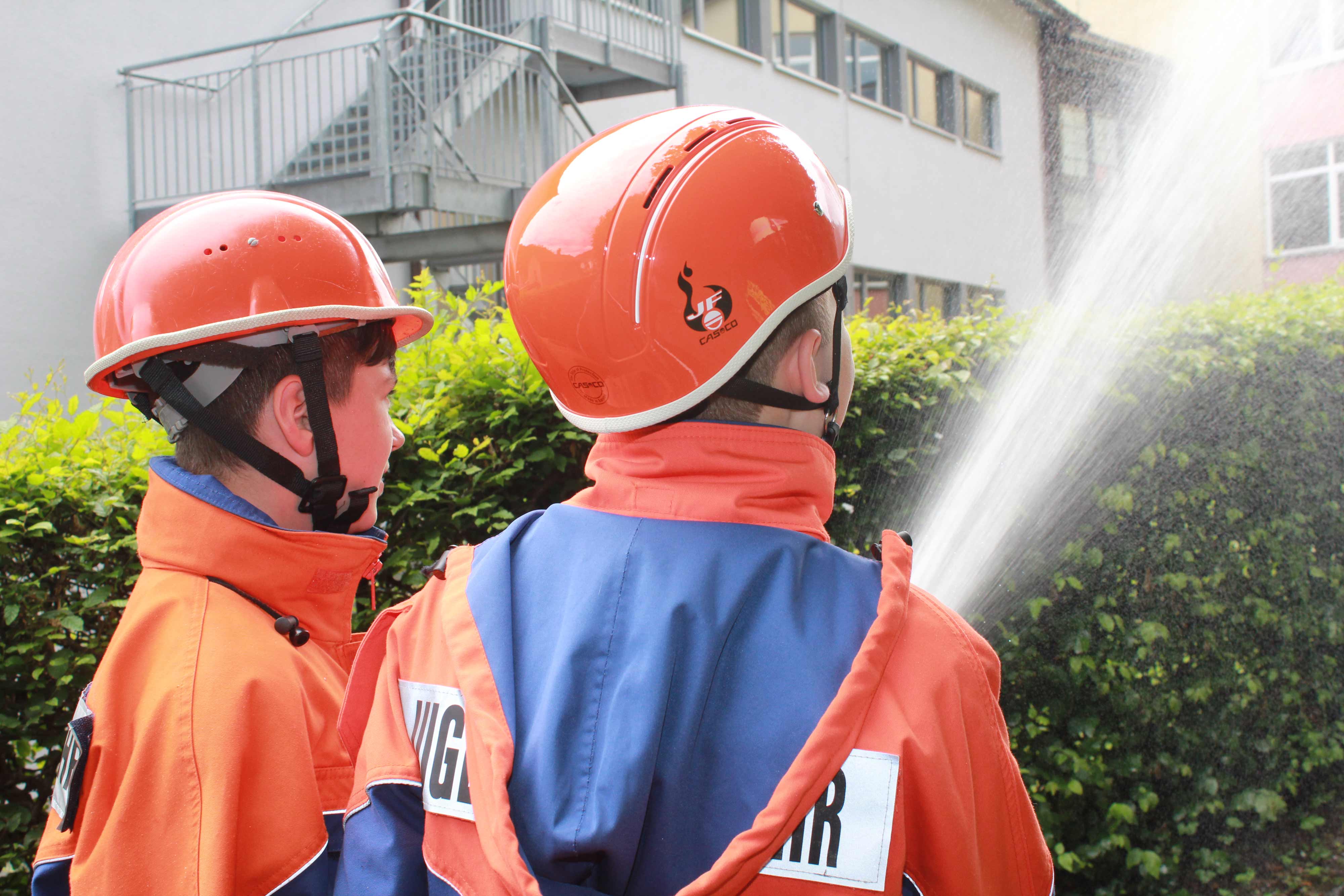 Nach dem Einsatz hatte ein Teil der Gruppe theoretischen Unterricht zum Thema Löschangriff, weitere Jugendfeuerwehrkameraden bereiteten das Mittagessen zu. Danach hatten alle Zeit für sich bevor dies durch einen weiteren Einsatz unterbrochen wurde: „Brand neben dem Hausmeisterhaus der Grund- und Hauptschule“ lautete das Einsatzstichwort. Nun konnte das theoretische Wissen in der Praxis eingesetzt werden. Nachdem die Pumpen zur Löschwasseraufnahme aus der Kinzig vorbereitet waren wurden mehrere Rohre vorgenommen. Das Wasser bat eine Willkommene Abkühlung an diesem heißen Wochenende.