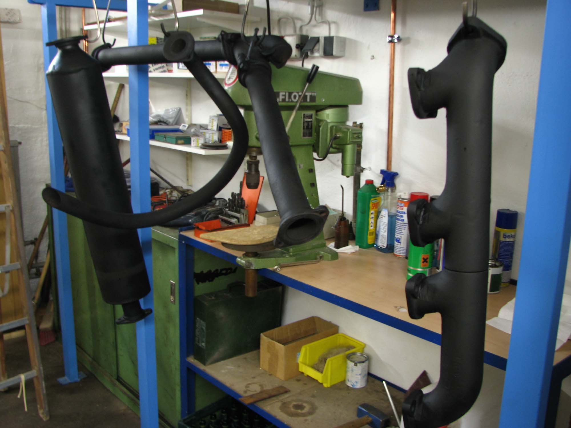 Der Auspuffkrümmer, das Auspuffrohr mit Umschaltklappe, der Auspufftopf sowie das Endrohr mussten zuerst gereinigt werden. Mit einem Reinigungsvlies sowie einer Drahtbürste wurden die ganzen Teile vom Rost und teilweise noch von Farbrückständen befreit. Vor der Lackierung stand noch eine Wäsche mit Verdünnung an. Da der Auspuff sehr hohen Temperaturen ausgesetzt ist, kam hier ein spezieller Hochtemperaturlack zum Einsatz. Nach dem Trocknen wird dieser dann in den nächsten Tagen in einem Ofen eingebrannt um seine endgültige Temperaturbeständigkeit zu erhalten.