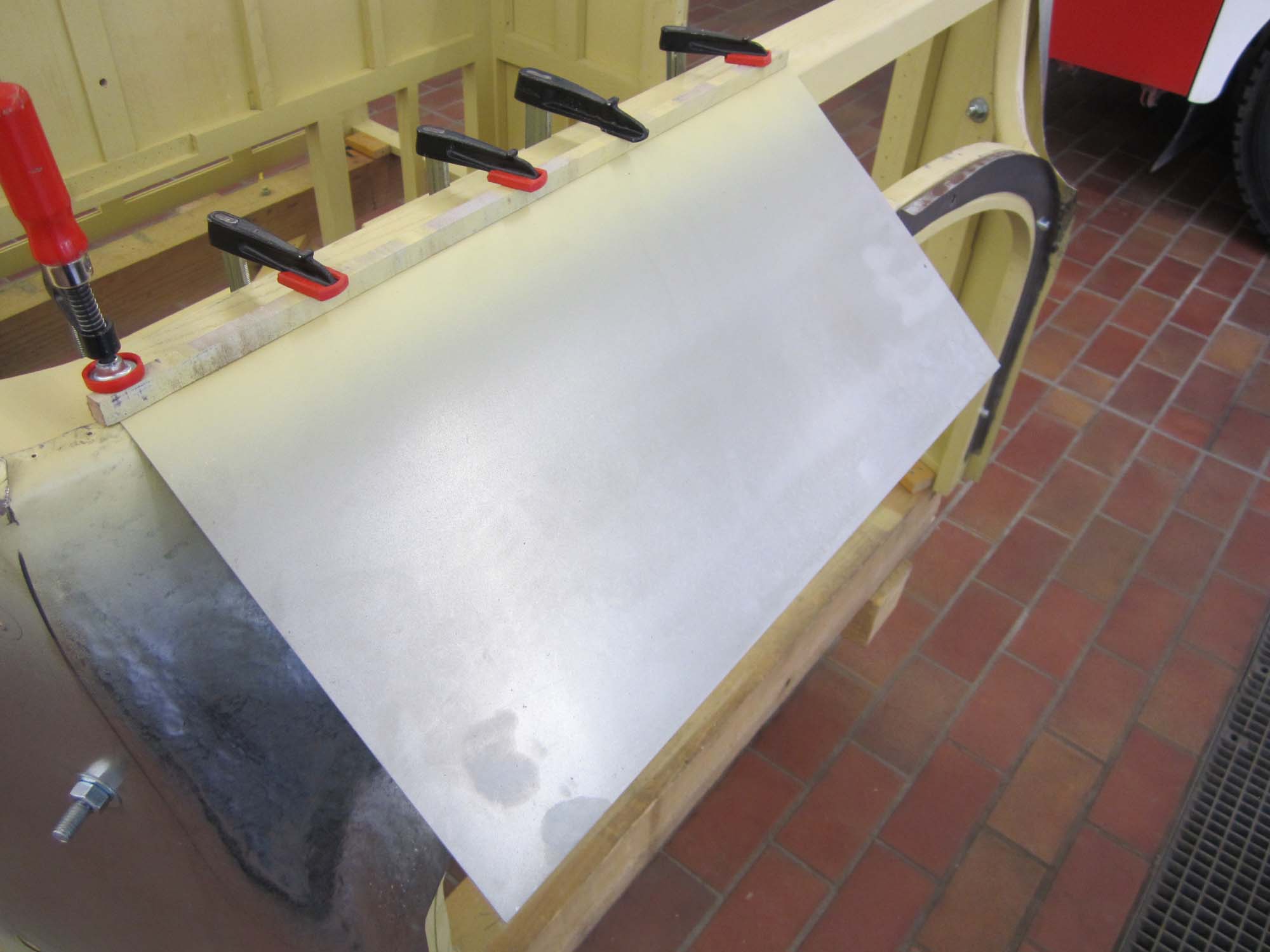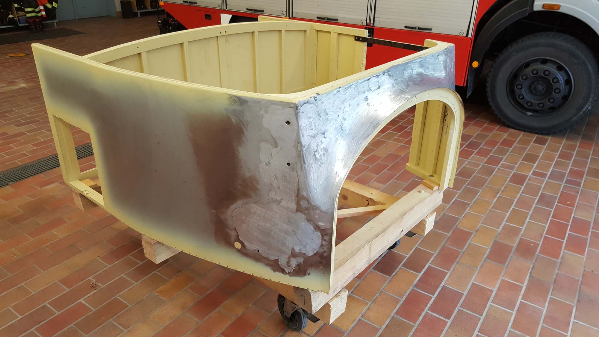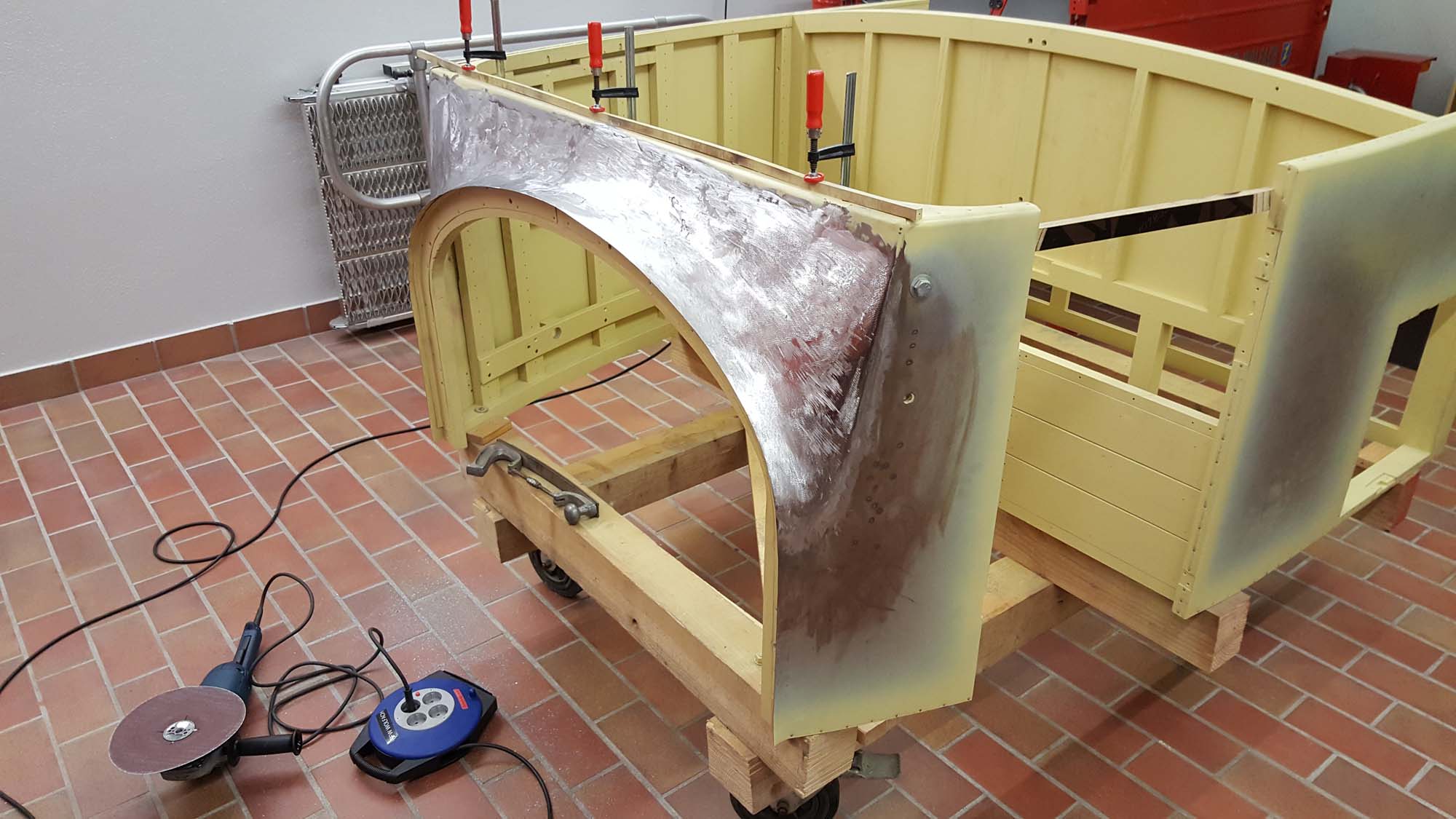 Dabei besteht der vordere Teil nicht nur aus einem Blech sondern aus zwei Teilen, die dann an den  beiden Seitenwände anschließen. So war es auch schon beim Originalblech gemacht. Das zuvor auf den Holzaufbau aufgenagelte Karosserieblech musste dazu erst einmal grob in Form gebracht werden. Dies wurde mit einem speziellen Holzhammer durchgeführt. Die vorderen Teile der Seitenwände wurden dabei grob in Richtung Mitte umgebördelt. Überschüssiges Blech konnte dann mit der Blechschere entfernt werden. Die Seitenbleche laufen dabei etwa 10 Zentimeter auf der Vorderseite in Richtung Aufbaumitte. Aufgrund der großen Formänderung des Blechs kann das seitliche Blech nicht bis in die Mitte geführt werden. In diesem Bereich sind dann zwei extra Blechteile eingesetzt. Auch diese wurden mit Hilfe des Holzhammers in die entsprechende Form gebracht. Besonders schwierig wird dies dadurch, dass das Blech hier in zwei Richtungen gebogen werden muss. Nach der Herstellung der groben Form, wurden die beiden mittleren Blechteile in der Mitte zusammengeschweißt und verschliffen. Im Anschluss daran folgte die Grundierung der Innenseite. Danach folgte noch einmal eine Bearbeitung mit dem Holzhammer um die Form weiter zu verbessern. Um das Blechteil zwischen die beiden Seitenteile einzusetzen wurde der überlappende Rand so abgeschnitten, dass die Bleche stumpf verschweißt werden können. Nach dem Punkten folgte dann das Schweißen, womit die Karosserie dann zu einem Stück zusammen gewachsen ist. Für die endgültige Form wurde das Blech dann noch einmal mit dem Holzhammer bearbeitet. Um die restlichen Unebenheiten zu entfernen und das Blech zu stabilisieren folgte dann die Verzinnung mit Karosseriezinn. Hierbei wird das Blech erwärm und mit dem zähflüssigen Zinn überzogen. Auch die Form kann dadurch noch etwas modelliert werden. Nachdem das Zinn erkaltet ist, folgte die mechanische Bearbeitung mit der Karosseriefeile. Die endgültige Oberfläche erhält man dann durch Schleifen. Nach dem Schleifen folgte dann die Grundierung der Karosserie. Kleine Unebenheiten wurden danach noch mit Spachtelmasse korrigiert, bevor dann die zweite und letzte Grundierschicht erfolgt.