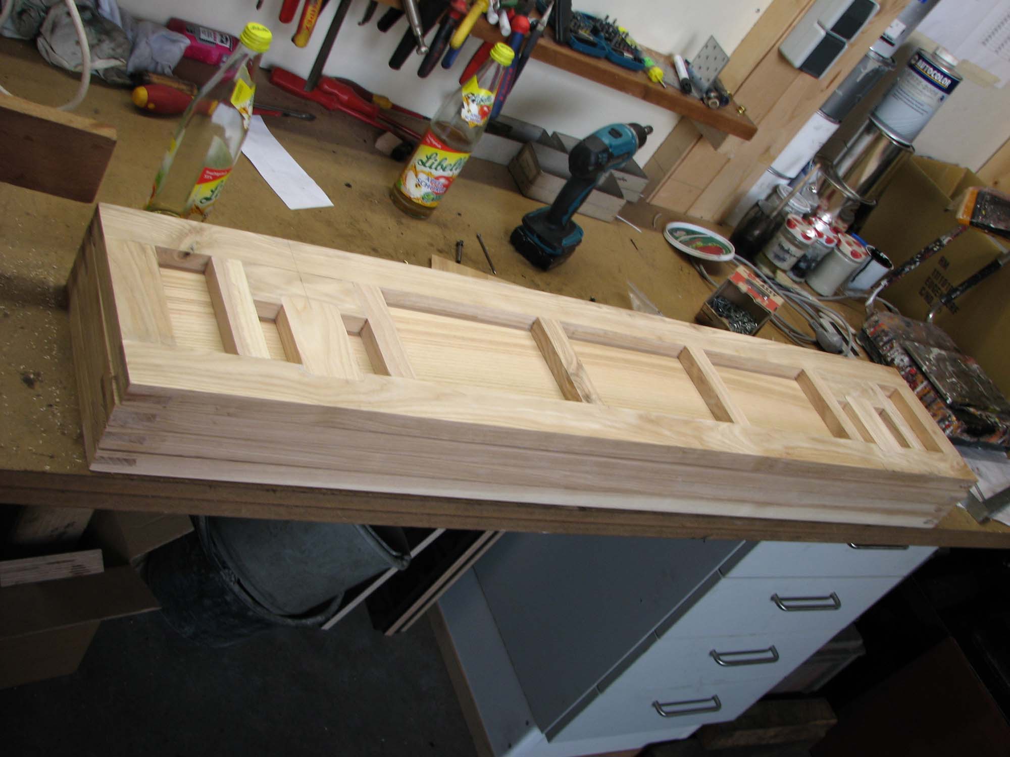 Dies ist Wichtig um letzte Korrekturen an den Seitenkästen durchzuführen und alle Teile gegenseitig anzupassen. Die hinteren Kotflügel sind hierfür vom gröbsten Schmutz und Rost befreit worden. Sie sind am unteren Ende mit den Kästen verschraubt. Das gleiche gilt für die vorderen Kotflügel, die im nächsten Schritt angepasst werden. Der gebogene obere Teil der Kästen passt sich hinten an die Rundung der Kotflügel an und Endet vorne am Armaturenbrett. Dieses wurde für diese Arbeiten schon einmal an die Halterungen geschraubt. Allerdings fehlen hier noch die endgültigen Konturen, die wir nach und nach wieder exakt rekonstruieren müssen. Da leider vom alten Brett nichts übrig geblieben ist, wird dies allerdings nicht ganz einfach werden. Parallel dazu werden gerade die Rückwand und die Klappen der Saugschlauchkästen hergestellt. Die Klappen sind dabei in aufwendiger Rahmenbauweise wieder so hergestellt worden wie dies schon früher der Fall war.