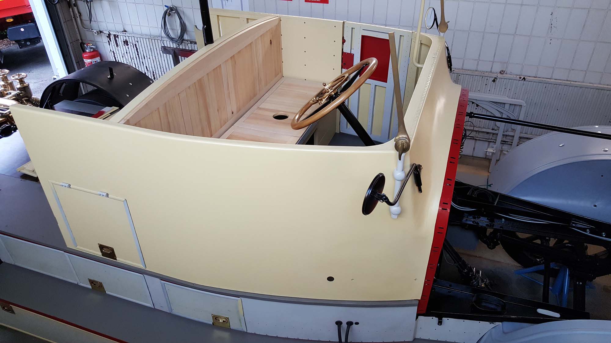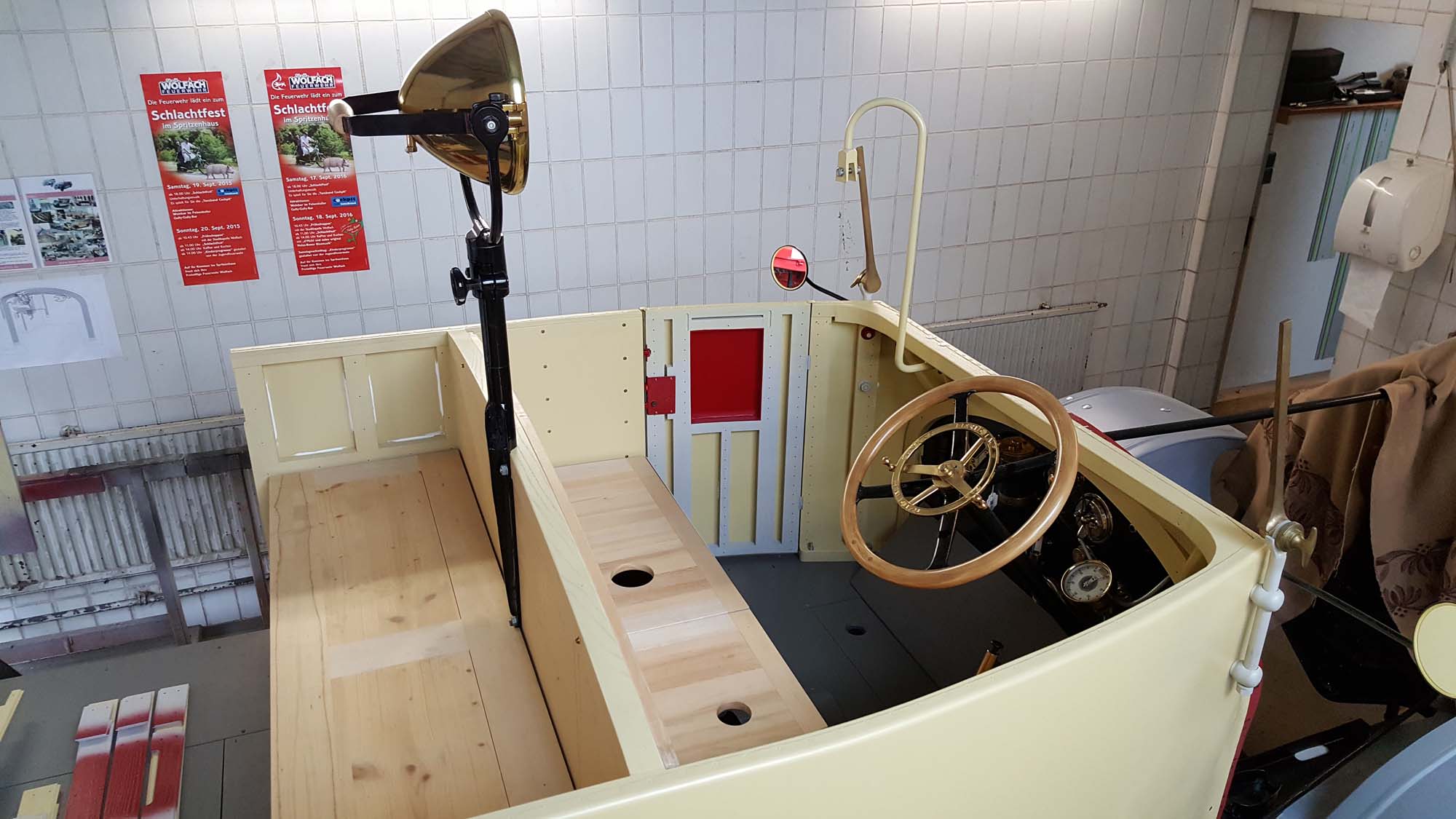 Die Türfächer sind Innen schon rot lackiert worden und es folgt dann die Anbringung der Innenverkleidung, die ja schon soweit vorbereitet ist. Außerdem werden die Polster der vorderen Sitzbank und der Linoleumbelag für die Mannschaftssitzbänke vorbereitet bzw. angepasst.