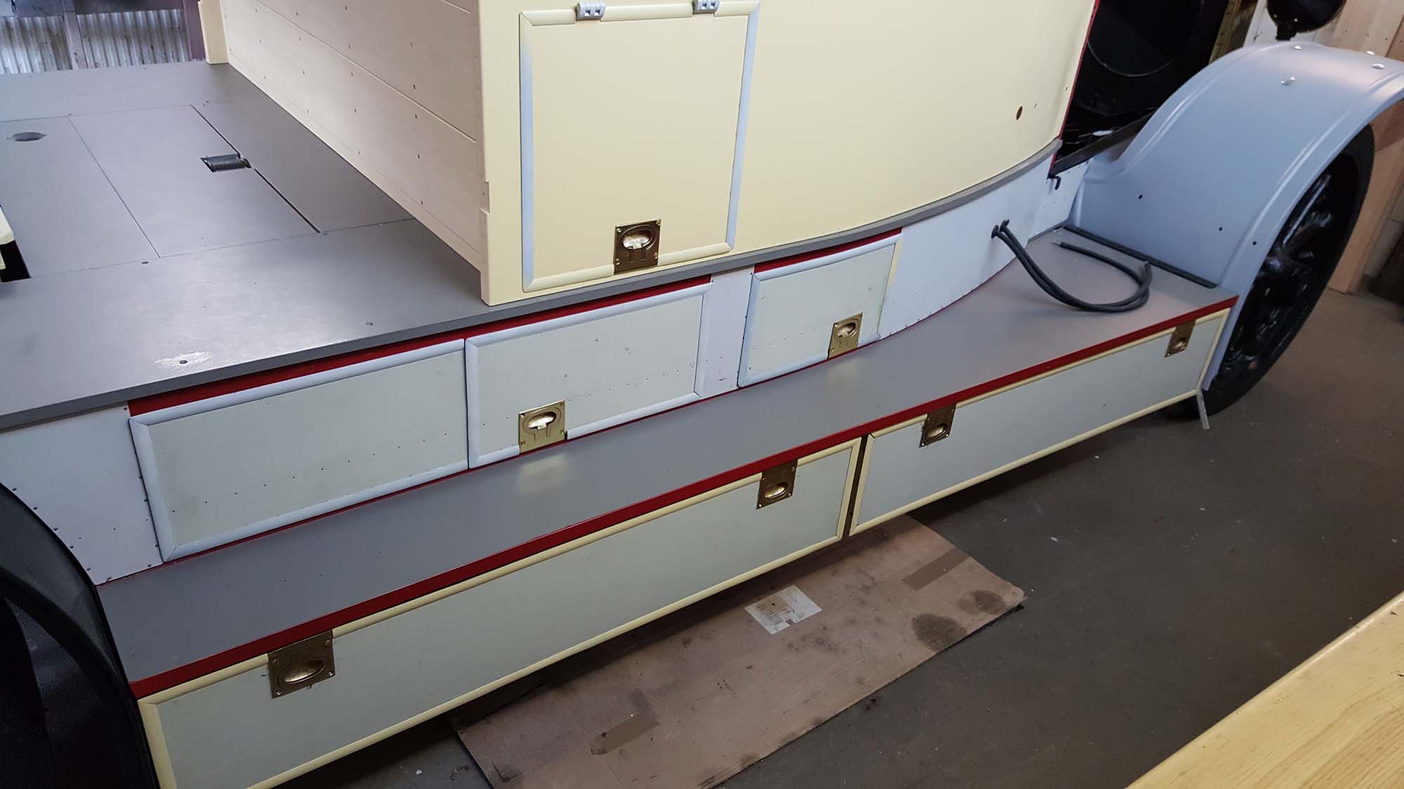 Wichtig ist dabei, dass diese einfach laufen und nicht am Aufbau streifen. Auch die Schlösser müssen problemlos funktionieren. Hierzu wurde nochmal an einigen Stellen nachgearbeitet, bevor der Aufbau dann lackiert wird. Auch alle Anbauteile wie die Halterung für den Arbeitsscheinwerfer, der Halter für die Glocke und die Ballhupe werden angebaut um zu sehen ob alles passt.