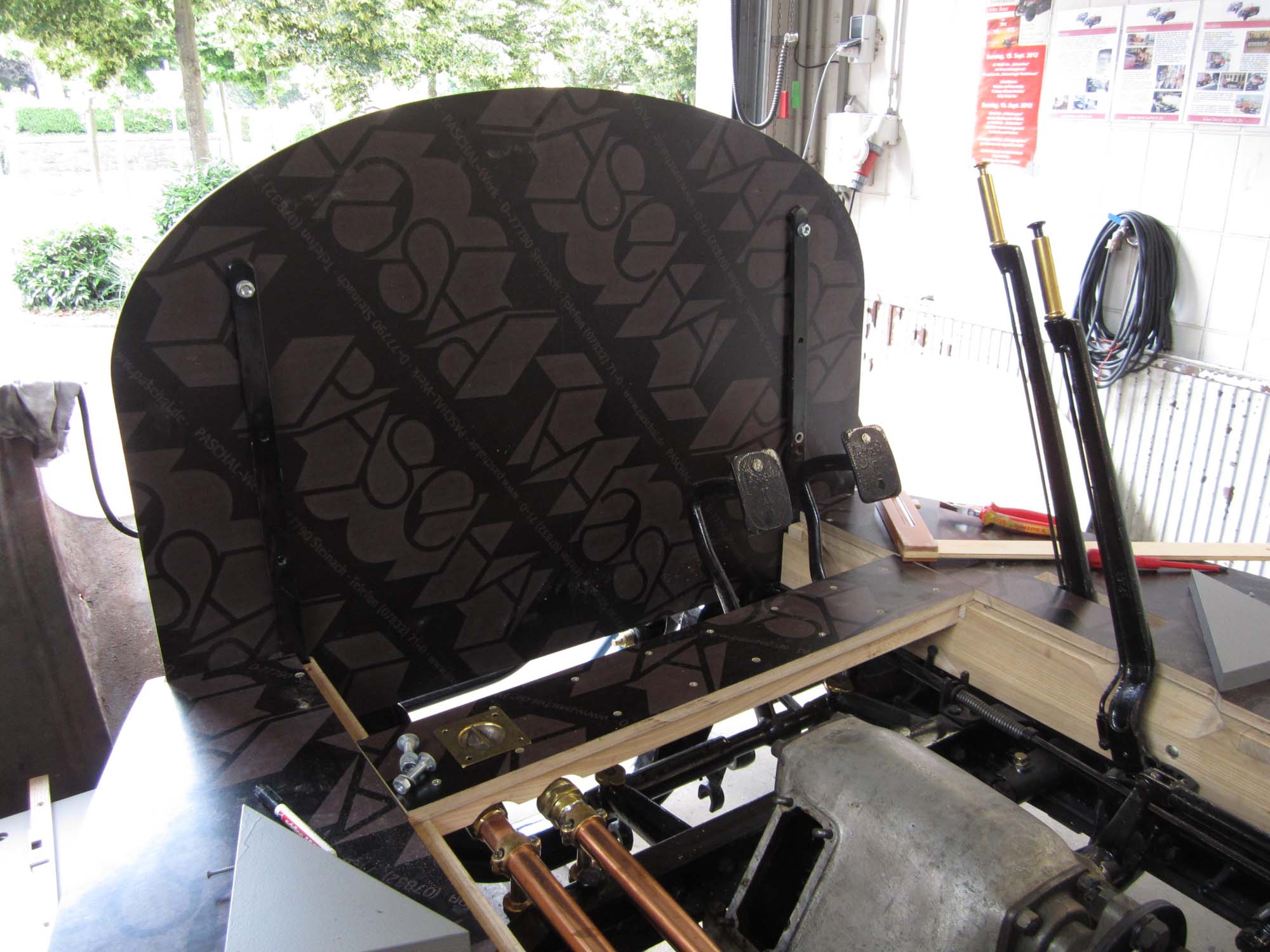Um sicherzustellen, dass der Übergang von Motorhaube zum Aufbau später keine Probleme bereitet, wurde für das Armaturenbrett (Spritzbrett) zuerst ein Modell erstellt. Mit leichten Korrekturen wurde jetzt das endgültige Armaturenbrett gesägt. Eine besondere Schwierigkeit stellt hier die gebogene Form dar. Da nach dem Brand von diesem Bauteil nichts übrig blieb, muss alles neu konstruiert werden. Der Bogen kann nur anhand von noch vorhandenen, aber stark deformierten Blechteilen und Bildern rekonstruiert werden. Ebenso die Anordnung der Armaturen. Auch diese müssen auf Grundlage von Fotos positioniert werden. Um den Grundrahmen für den Aufbau zu fertigen, wurde eine Schablone mit den genauen Ausmaßen des Fahrzeuges erstellt.  Dieser Rahmen wird in den nächsten Monaten erstellt werden.