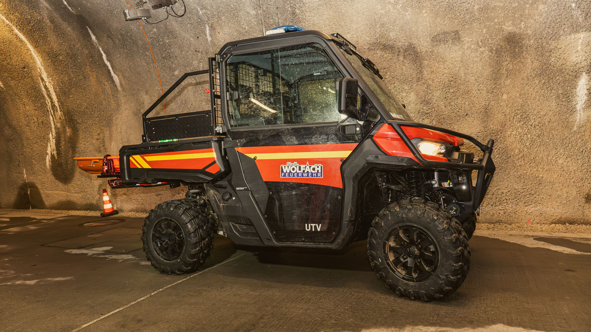 Auf Grund der Hochgeländegängigkeit des Fahrzeugs kommt der Can-Am Traxter nicht nur im Bereich der Tunnelrettung zum Einsatz. Da das Multitalent problemlos so gut wie jeden Einsatzort auf den Bergen und in den engen Schwarzwaldtälern erreichen kann, eignet der Neuzugang auch optimal zur Rettung von verunfallten Forstarbeitern, Wanderern und gestürzten Mountainbikern. „Durch die verlastete Schleifkorbtrage, die auf einem steckbaren Tragesystem im Bereich der Ladefläche arretiert werden kann, können Patienten schonend aus dem Gelände zum Rettungswagen transportiert werden“, hat Kommandant Christoph Mayer am Freitag bei der Übergabe erläutert.