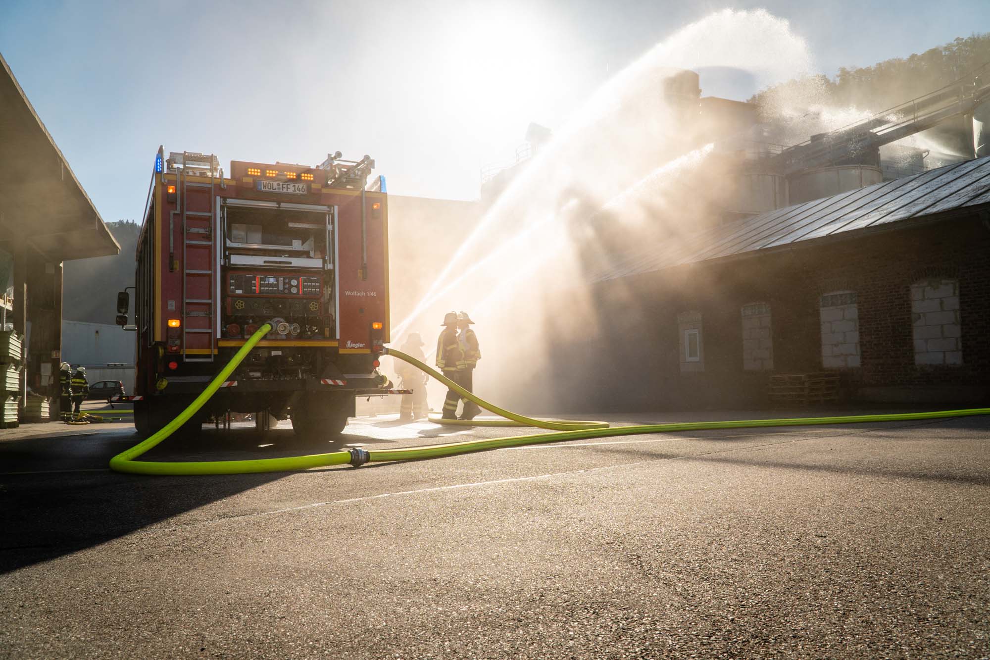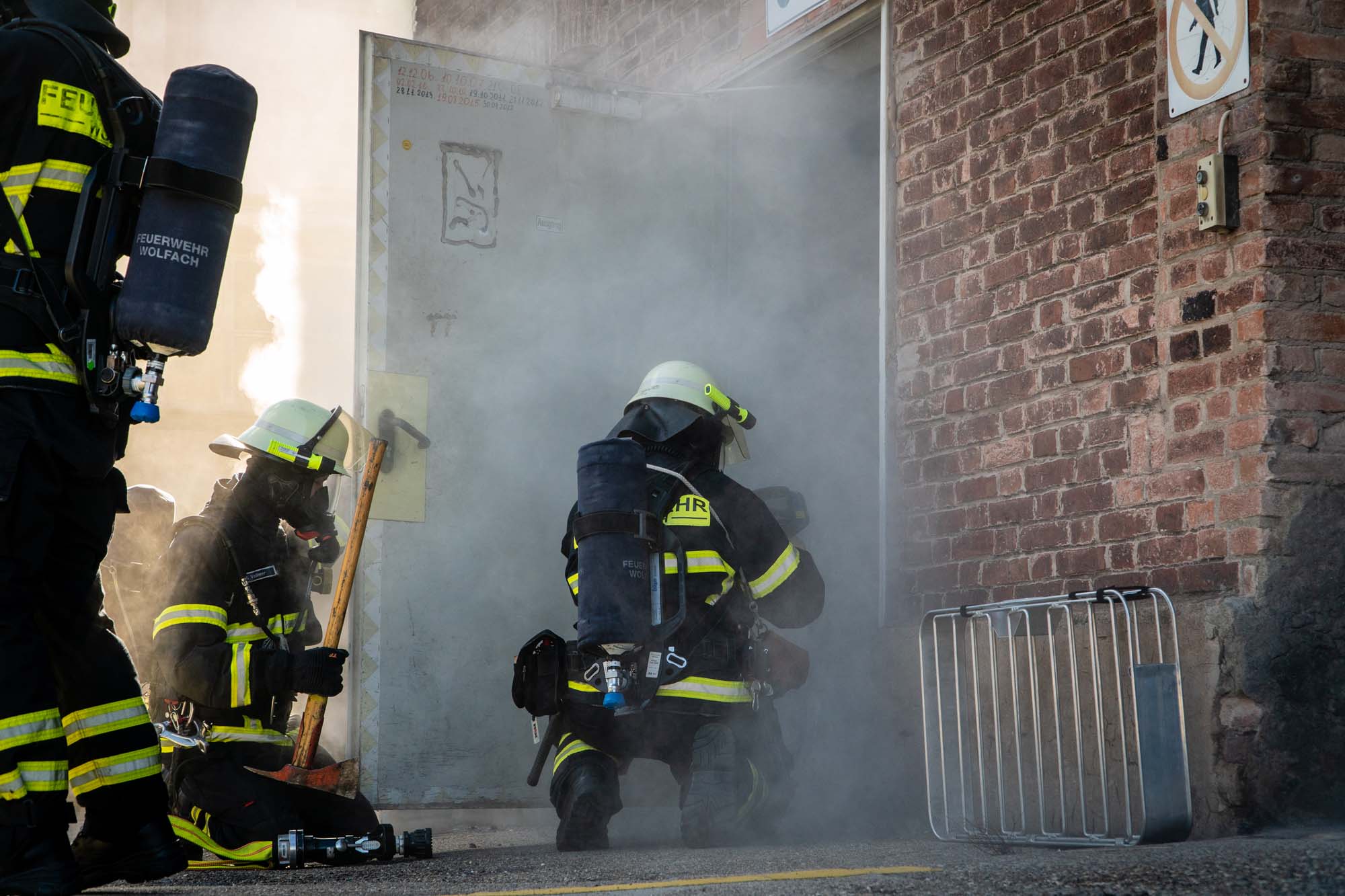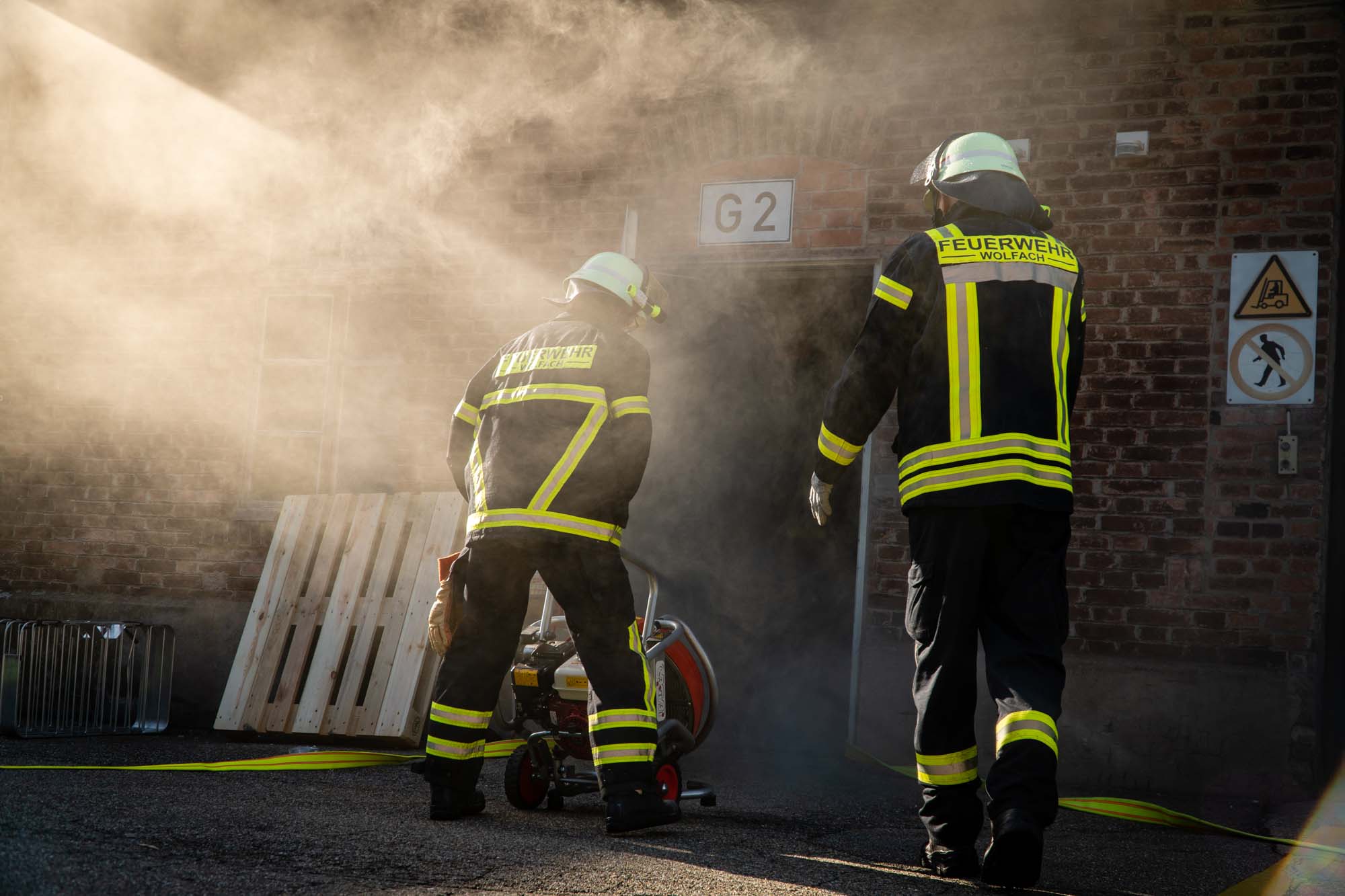 In einem Industriekomplex auf dem Gelände der Firma Sachtleben war ein fiktives Feuer ausgebrochen und der Hausmeister äußerte den zuerst eintreffenden Einsatzkräften den Verdacht, dass sich noch sieben seiner Kollegen im Gebäude befänden. Bereits nach kurzer Zeit konnten die vorrückenden Atemschutzgeräteträger die Vermissten retten und dem DRK OV Wolfach zur Betreuung übergeben.
