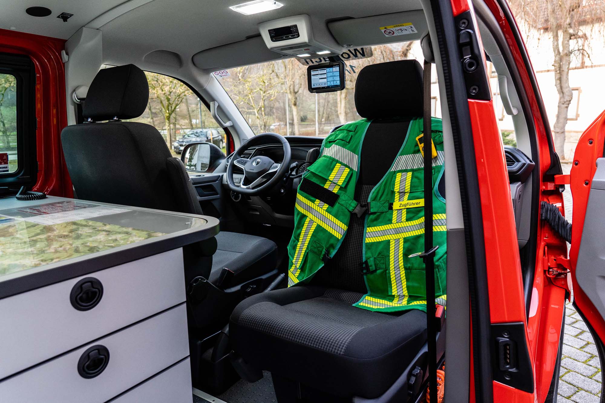 Im Innenraum wurden vier Funkgeräte verbaut, welche über die zwei Funkarbeitsplätze bedient werden können. Fahrer- und Beifahrersitz können bei größeren Schadenslagen gedreht und ebenfalls im Rahmen der Einsatzführung verwendet werden. Zur Dokumentation und Informationsbeschaffung steht ein PC und Multifunktionsgerät mit Internetanbindung zur Verfügung.