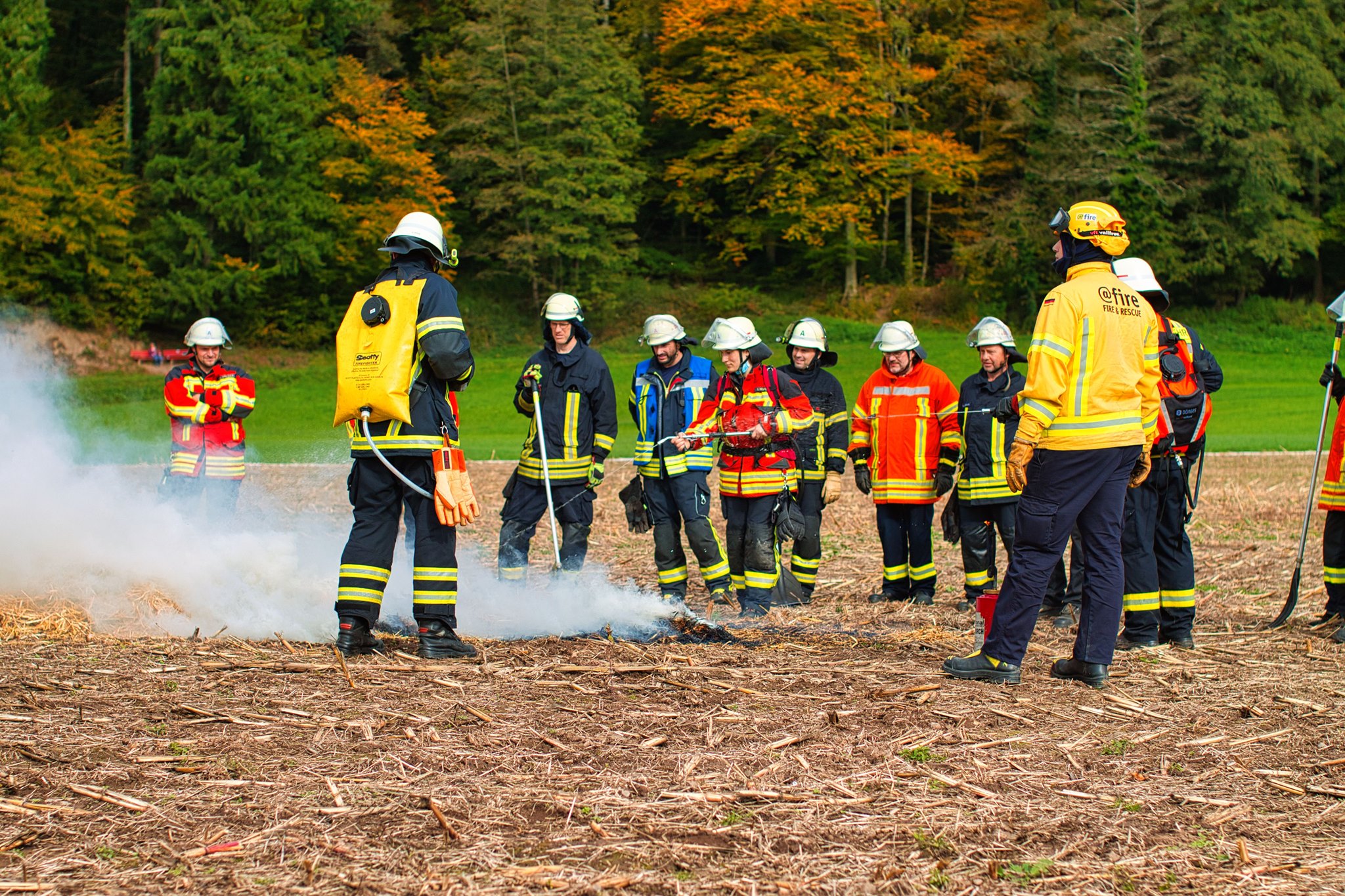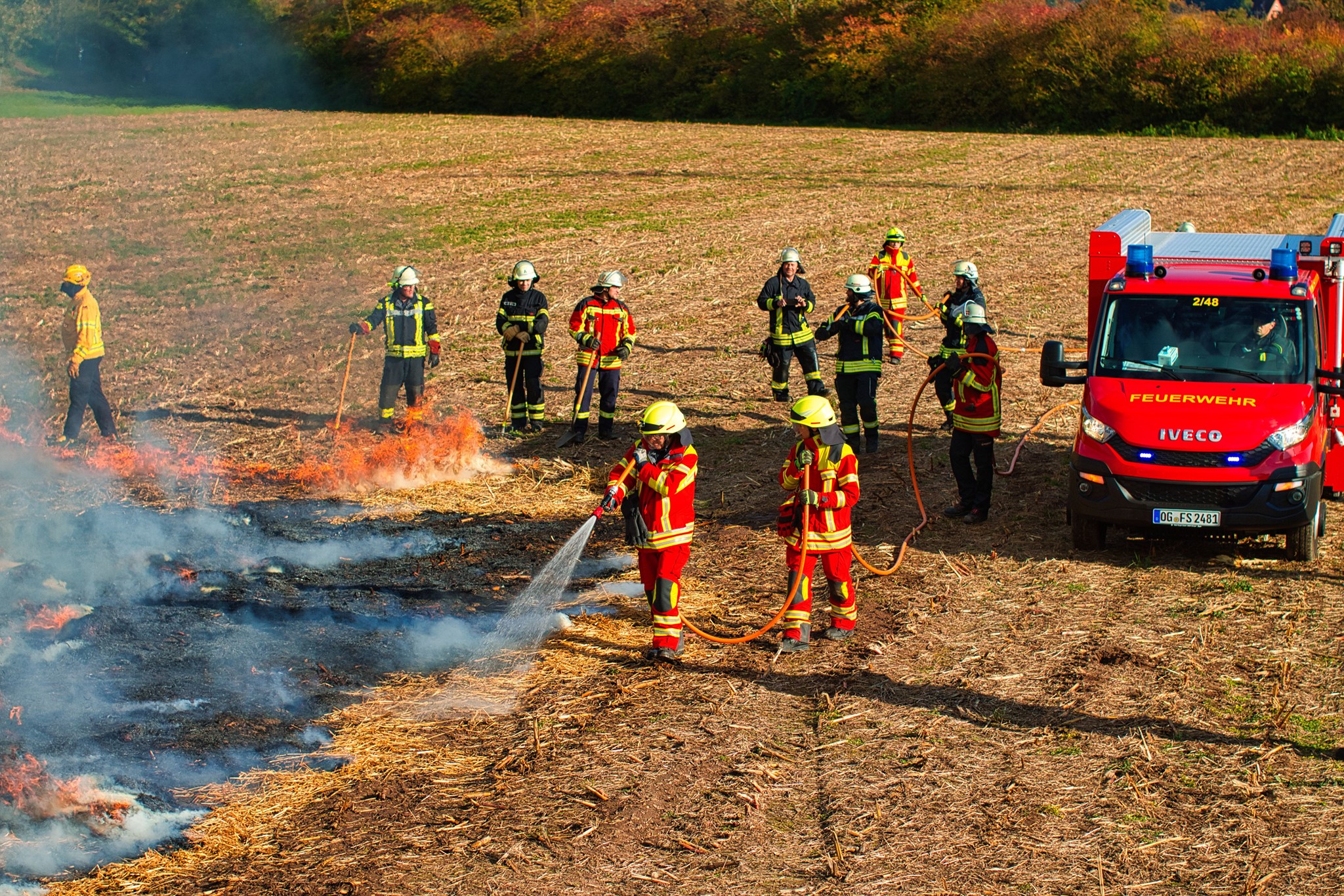 Am Ende des Seminars mussten dann alle erlernten Fähigkeiten bei einer Abschlussübung angewendet werden, denn die Ausbilder hatten auf einem abgeernteten Feld einen Flächenbrand entzündet, der gelöscht werden musste.