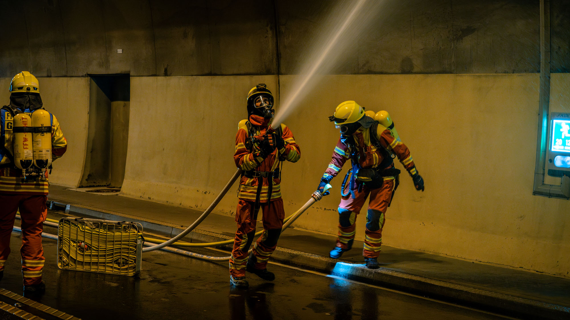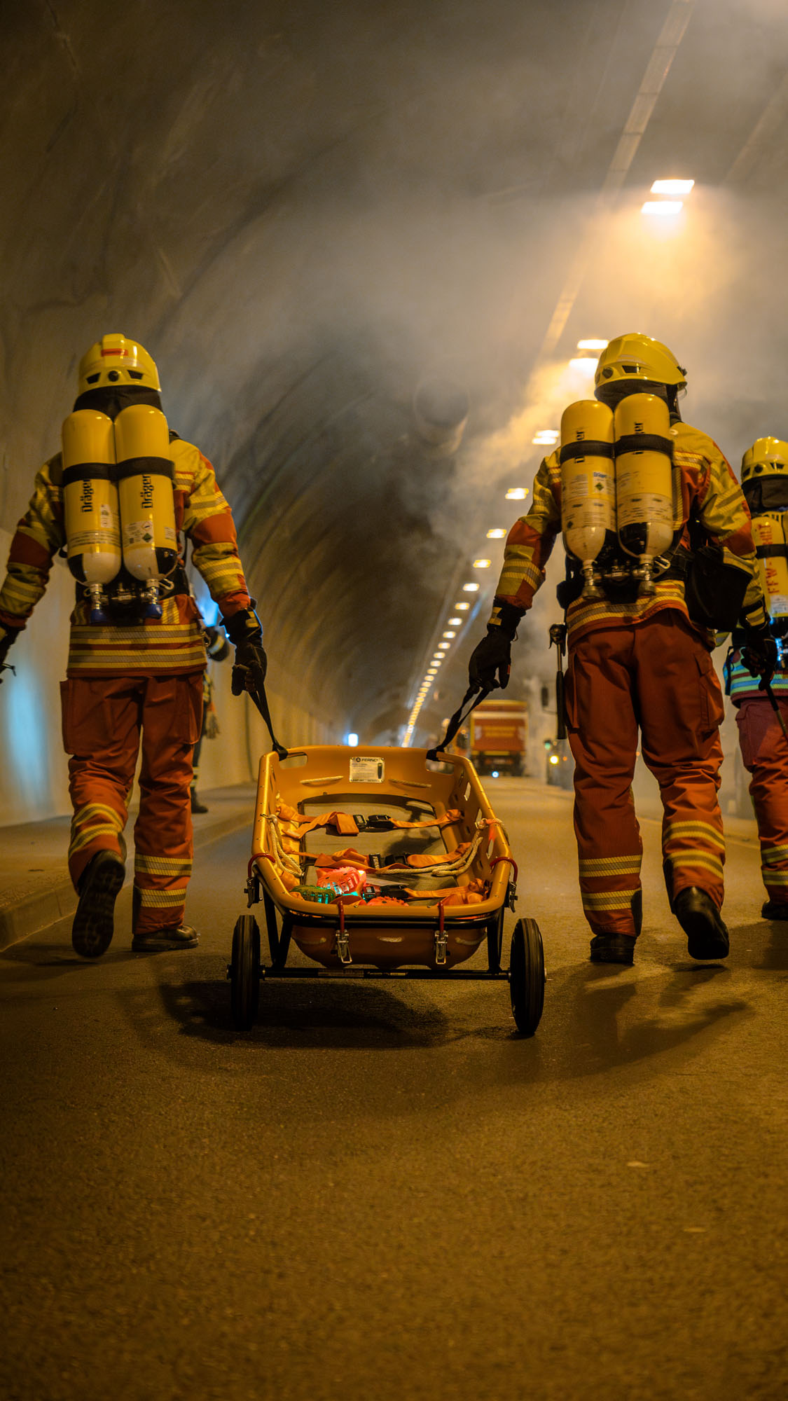 Brände in Straßentunneln stellen die Einsatzkräfte immer vor besondere Herausforderungen. Hitze und Rauch erschweren die Arbeitsbedingungen, es müssen weite Wegstrecken zurückgelegt werden, das Feuer muss rasch gelöscht werden und möglicherweise benötigen noch eingeschlossene Verkehrsteilnehmer dringend Hilfe der Atemschutzgeräteträger.