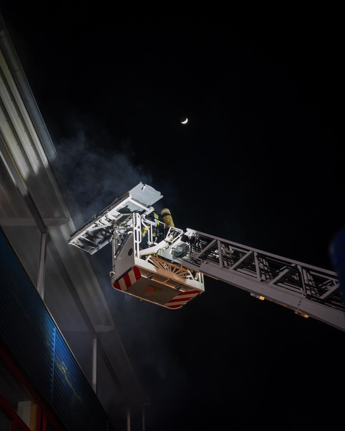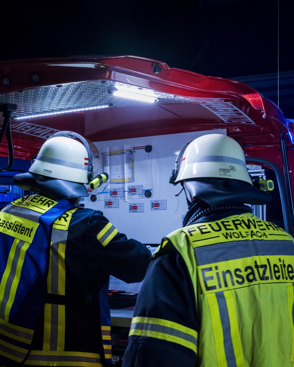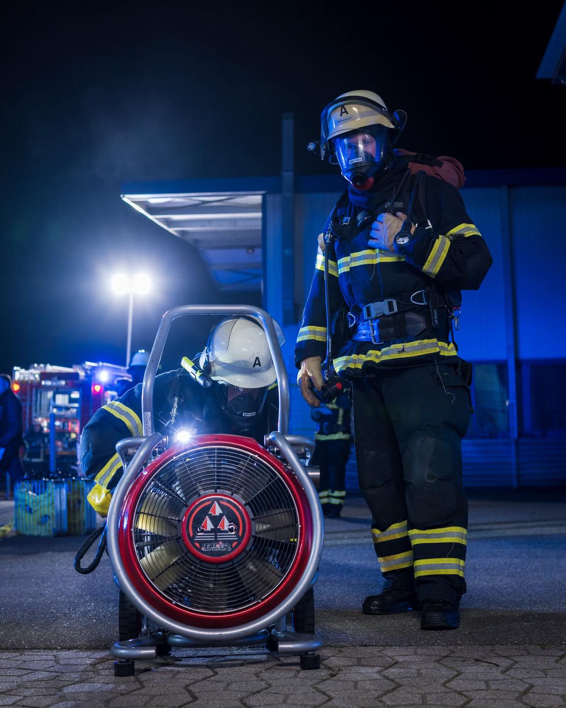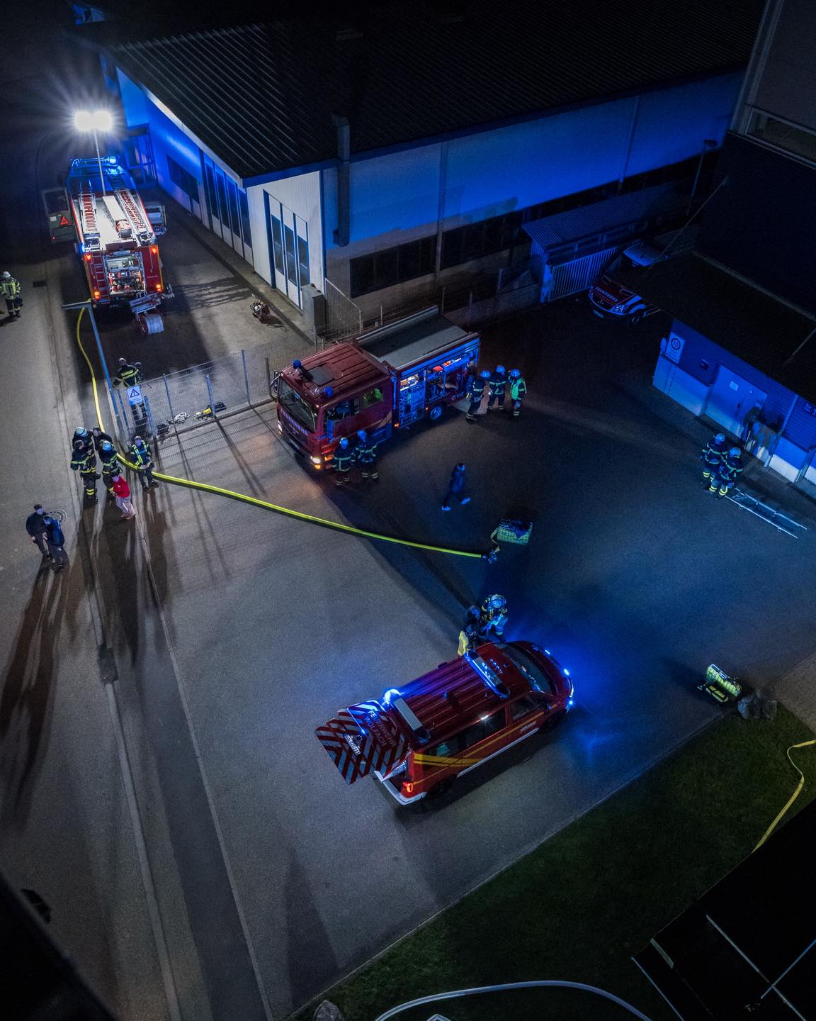 Im Bereich der Kantine kam es zu einem fiktiven Brand, welcher durch die Einsatzkräfte bekämpft werden musste. Da zu diesem Zeitpunkt aber auch eine Firmenfeier stattfand, musste die Einsatzleitung selbstverständlich auch eine umfangreiche Menschenrettung koordinieren, wo auch die Drehleiter der Feuerwehr Hausach zum Einsatz kam.